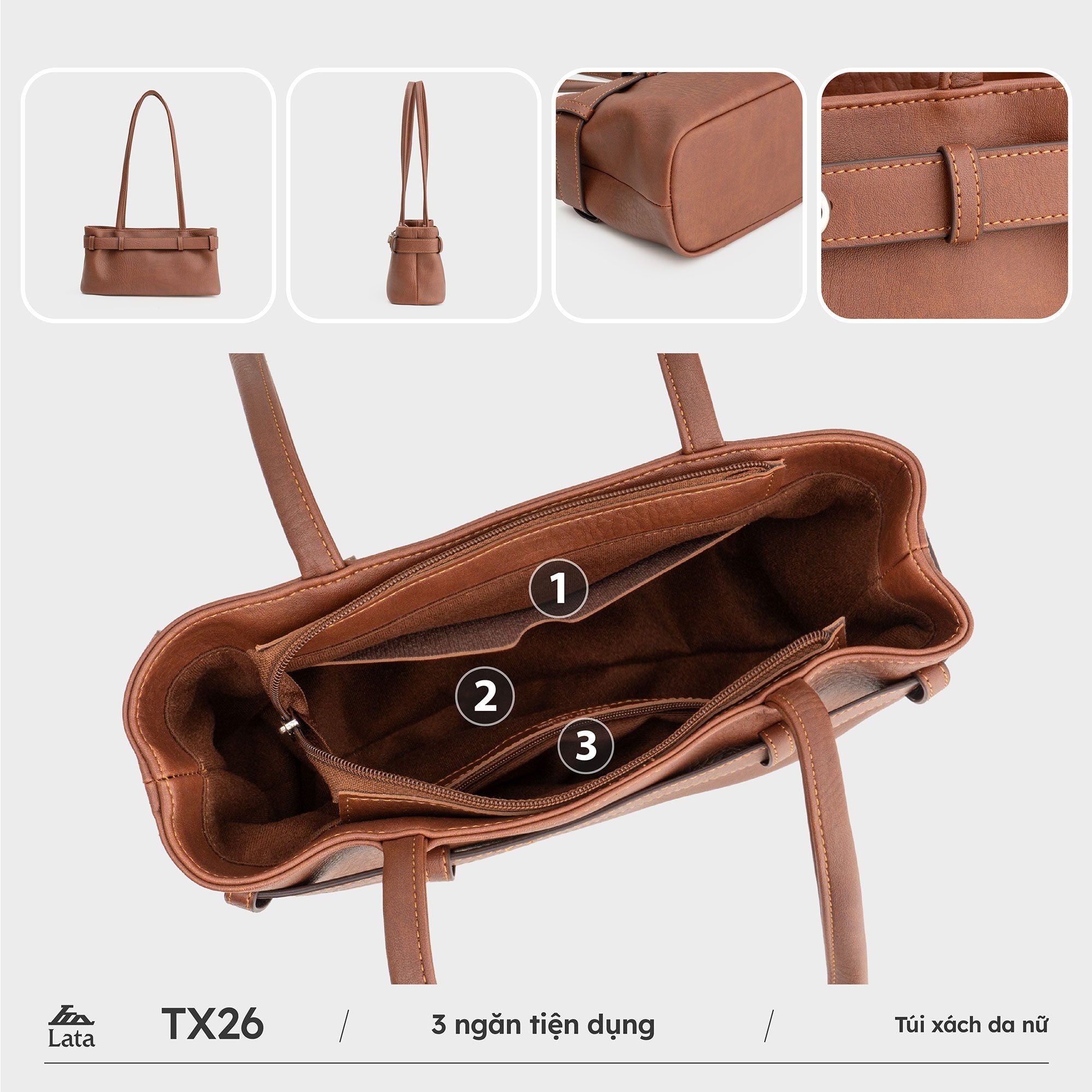 Túi xách tay Lata TX26 với form dáng dài thanh thoát, quai đeo vai mềm mại và khóa kim loại nổi bật, chiếc túi dễ dàng tôn lên sự duyên dáng và phong cách thời trang riêng biệt. Kích thước size 30 vừa vặn giúp nàng mang theo điện thoại, ví, son môi và những vật dụng thiết yếu mỗi ngày. Ngăn chính rộng rãi kết hợp ngăn phụ tiện lợi, khóa kéo chắc chắn giúp giữ đồ an toàn. Cho dù bạn chọn diện đồ công sở, đi chơi hay dạo phố, chiếc túi này đều dễ dàng phối hợp cùng các outfit để tạo điểm nhấn đầy nữ tính và tinh tế.